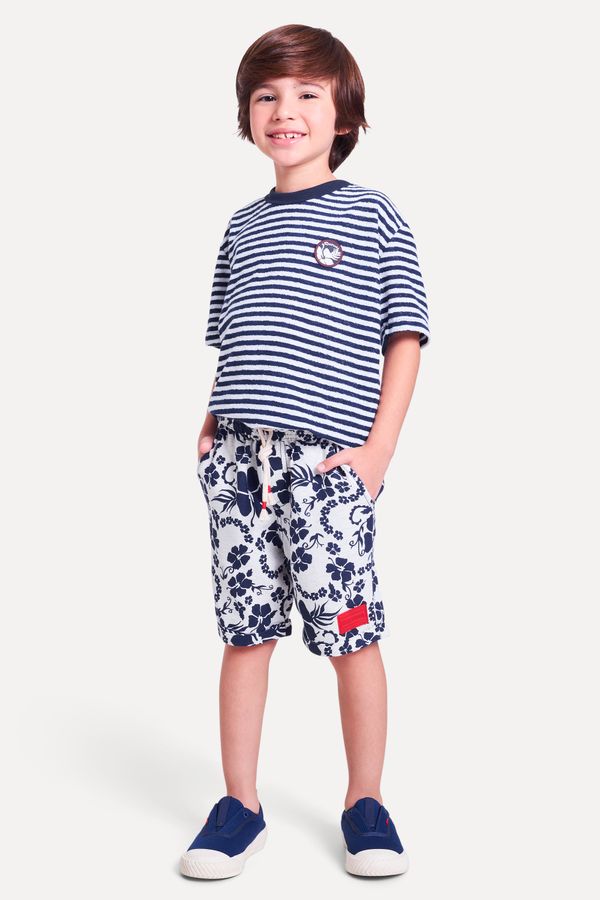 Bermuda da linha infantil Reserva Mini. O modelo em algodão misto possui cós de elástico, dois bolsos na frente e bolsos five pockets nas costas. Ganhou ainda ilhóses e cadarço com detalhe de linha contrastante na ponta. A estampa é a cara do verão! Produzido eticamente no Brasil. Comprando esta peça, você viabiliza cinco pratos de comida através do nosso programa 1P5P.