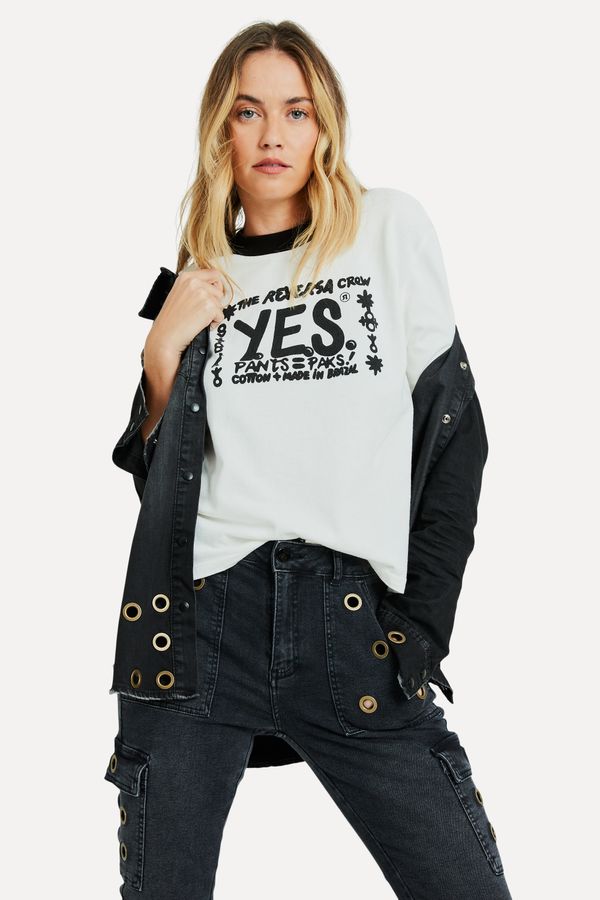 O Blusão YES é confeccionado em 100% algodão, o que o torna extremamente confortável e macio. É um moletom amplo, superconfortável, que pode ser usado em diversas ocasiões. Possui uma arte inspirada nos anos 90, com cores fortes, pode ser combinada jeans, couro ou uma sarja. Overtop Reversa produzida eticamente no Brasil. Comprando esta peça, você viabiliza cinco pratos de comida através do nosso programa 1P5P. A modelo mede 1,76 m de altura e 84 cm de busto.