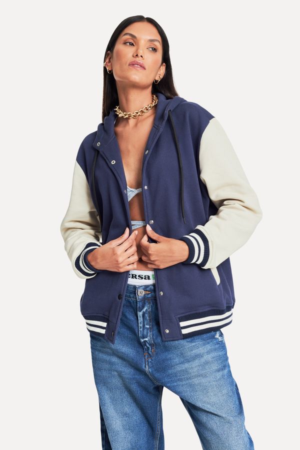 Bomber Bicolor League tem modelagem clássica e estilo college, garantindo um estilo especial. Indicada para ser usada em dias frios como sobreposição. Bomber Feminina Reversa produzido eticamente no Brasil. Comprando esta peça, você viabiliza cinco pratos de comida através do nosso programa 1P5P. A modelo mede 1,78 m e 87 cm de busto.