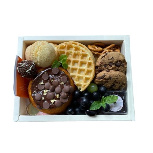 DESCRIÇÃO:- Caixa de café da manhã Kids COMPOSIÇÃO:caixa de papel com tampa de acetato- Bolo caseirinho de cenoura com chocolate - 01 achocolatado todynho- 01 Danone 90g- 3 brigadeiros - 3 pães de queijo recheados de catupiry - Mini pretzels - Queijo mussarela em formato de coração - pote de Nutella 30g- uvas- morangos - cokkies- waffle DETALHES:PERSONALIZE SEU PRESENTEApós selecionar a data e período de entrega você poderá escolher os melhores complementos para o seu presente como pelúcias, chocolates, bebidas entre outros itens para deixar o seu presente ainda mais perfeito.CARTÃO:É possível incluir uma mensagem junto ao seu presente! Prossiga com a compra e na tela de "ENTREGA" basta escolher o cartão e escrever a mensagem. Caso queira enviar em Anônimo, escolha a opção "NÃO QUERO CARTÃO".ENTREGA E FRETE:Para consultar o prazo e valor de entrega, preencha o CEP de entrega, clique em OK e verifique as opções disponíveis. Caso queira acompanhar a entrega do seu presente, informe o seu número do celular.IMPORTANTENós trabalhamos com lojas parceiras por todo o Brasil que possuem treinamento, experiência e materiais para manter a qualidade exigida.Porém, devido às características de cada local, variações naturais das flores e outras interferências, os produtos podem sofrer alterações.As imagens exibidas são meramente ilustrativas