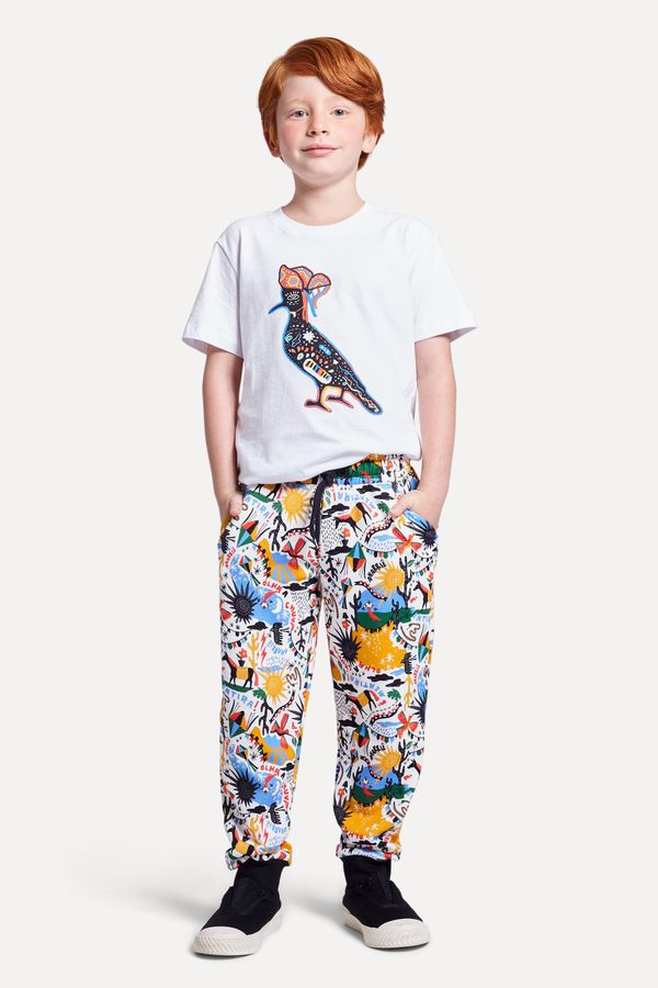 Calça jogger infantil de moletom em algodão e poliéster. Estampa exclusiva Xiloreserva colorida. Possui os punhos pretos em rib. Cós franzido com cadarço e ilhoses pretos. Possui etiqueta emborrachada retangular preta no centro do bolso traseiro. Produzido eticamente no Brasil. Comprando esta peça, você complementa cinco pratos de comida através do nosso programa 1P=5P.
