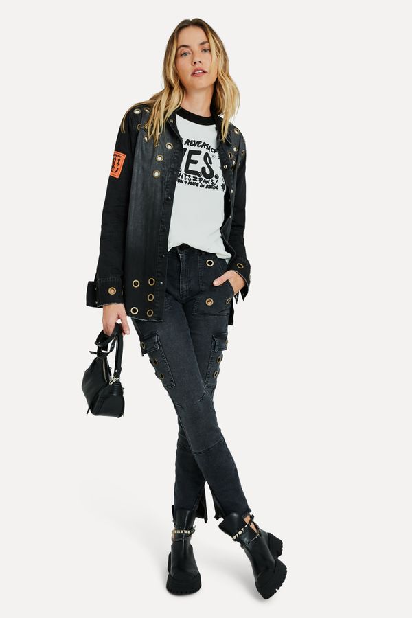 A Calça Yes Black Jeans Nina Flare é perfeita para mulheres modernas e urbanas. Sua modelagem flare traz um ar mais descontraído e moderno para a peça, que pode ser usada com peças mais secas, ou com a camisa da mesma família. A lavagem black jeans dá um toque de sofisticação à calça, e os ilhóses dão um toque de personalidade. É uma calça com ar mais urbano, que pode ser usada em diversas ocasiões. Calça Flare Reversa produzida eticamente no Brasil. Comprando esta peça, você viabiliza cinco pratos de comida através do nosso programa 1P5P. A modelo mede 1,76 m de altura, 60 cm de cintura e 90 cm de quadril.