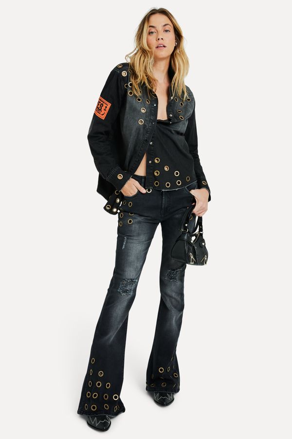 A Calça Yes Black Jeans Nina Flare é perfeita para mulheres modernas e urbanas. Sua modelagem flare traz um ar mais descontraído e moderno para a peça, que pode ser usada com peças mais secas, ou com a camisa da mesma família. A lavagem black jeans dá um toque de sofisticação à calça, e os ilhóses dão um toque de personalidade. É uma calça com ar mais urbano, que pode ser usada em diversas ocasiões. Calça Flare Reversa produzida eticamente no Brasil. Comprando esta peça, você viabiliza cinco pratos de comida através do nosso programa 1P5P. A modelo mede 1,76 m de altura, 60 cm de cintura e 90 cm de quadril.
