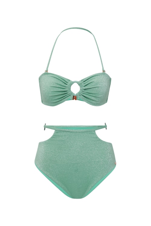 Ir Para Lojacalcinha biquíni Zoe Serena - Verde O bottom Zoe possui quatro argolas metálicas na cor verde e amarração de laços. É um bottom cortininha nada básico e com cobertura midi. A lycra possui fios prateados de lurex que deixam a peça com um brilho suave. A cor verde menta é calma e linda!Modo de lavar: Lavar a mãoComposição: Tecido 1 : 80,9% poliamida 9,5%elastano Tecido 2 : 92%poliamida 9% elastanoCor: VerdeMarca: Suntime