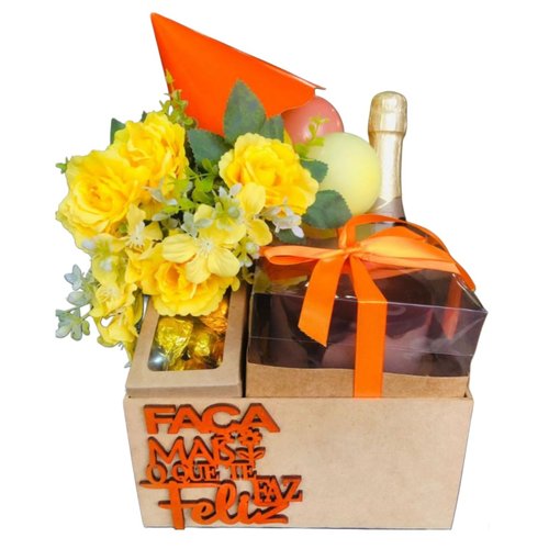 DESCRIÇÃO:Um mega presente dourado e iluminado para Alegrar e Abrilhantar o dia de uma Mulher Especial. COMPOSIÇÃO:1 caixote em pinus decorado com laço de fita 1 baby Chandon 1 embalagem com 6 brigadeiros 1 caixinha de Ferrero rocher com 4 unidades 1 taça em acrílico 1 arranjo floral com dois girassóis e mix de folhagensDETALHES:PERSONALIZE SEU PRESENTEApós selecionar a data e período de entrega você poderá escolher os melhores complementos para o seu presente como pelúcias, chocolates, bebidas entre outros itens para deixar o seu presente ainda mais perfeito.CARTÃO:É possível incluir uma mensagem junto ao seu presente! Prossiga com a compra e na tela de "ENTREGA" basta escolher o cartão e escrever a mensagem. Caso queira enviar em Anônimo, escolha a opção "NÃO QUERO CARTÃO". ENTREGA E FRETE:Para consultar o prazo e valor de entrega, preencha o CEP de entrega, clique em OK e verifique as opções disponíveis. Caso queira acompanhar a entrega do seu presente, informe o seu número do celular. IMPORTANTENós trabalhamos com lojas parceiras por todo o Brasil que possuem treinamento, experiência e materiais para manter a qualidade exigida.Porém, devido às características de cada local, variações naturais das flores e outras interferências, os produtos podem sofrer alterações.As imagens exibidas são meramente ilustrativas