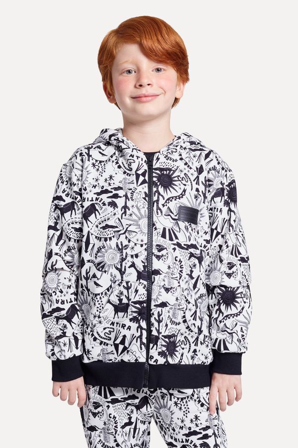 Casaco infantil de moletom de algodão com poliéster. Estampa exclusiva Xiloreserva Preto e branca. Possui zíper frontal, capuz com cardarço para regulagem e ilhoses. A assinatura fica por conta da etiqueta emborrachada retangular preta no busto esquerdo. Produzido eticamente no Brasil. Comprando esta peça, você complementa cinco pratos de comida através do nosso programa 1P=5P.