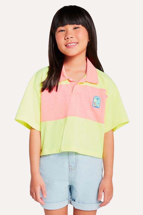 Polo infantil com recortes da reserva Mini para meninas. Modelo que e uma super novidade, em cores neon, super alegre e com patch do nosso querido pica-pau com coqueiros. O modelo e cropped e oversized, com obro deslocado e folgadinha nas laterais do corpo.