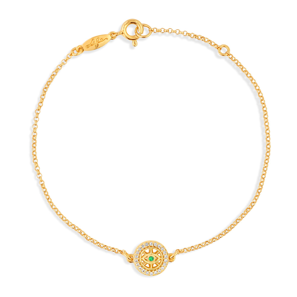 Pulseira Life Talismã Olho De Deus em Prata 925 com Banho de Ouro Amarelo 18k e Pedras Verdes e Incolores