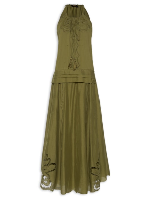 Vestido Voil Com Pala Na Cintura - Verde Vestido Voil Com Pala Na Cintura, Animale.O vestido verde é confeccionado em voil sem elasticidade. A peça solta ao corpo possui decote halter, alças finas em tiras alongadas embutidas na parte frontal para amarração, aplicação de bordado rechilieu com recortes vazados, babados aplicados na altura do quadril, barra assimétrica, forro e comprimento longo.Especificações & Cuidados: Lavar à mãoComposição: 100% AlgodãoCor: VerdeMarca: Animale